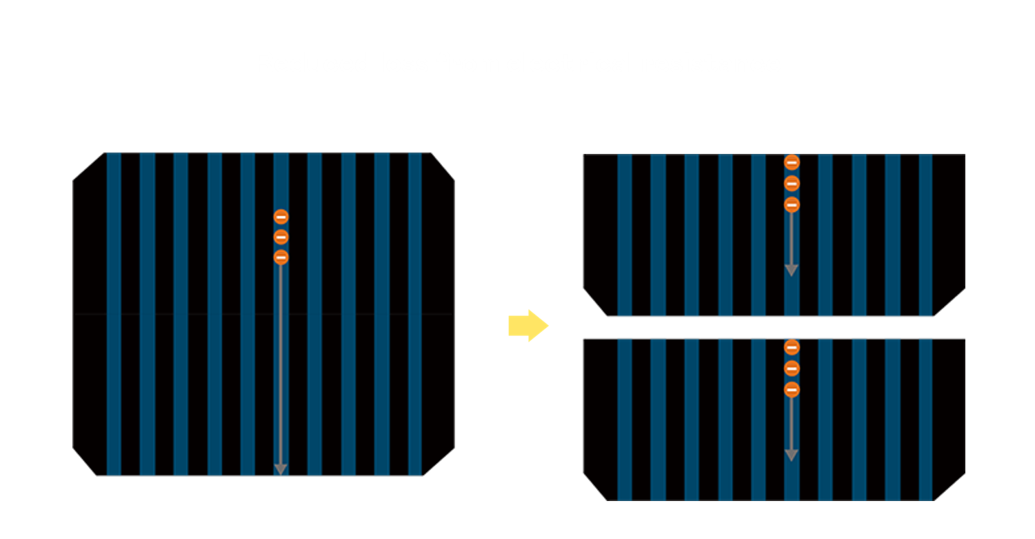 - 電池使用多條銅導線 (Copper wire) 於電池片上形成較短的電流路徑,提高電流收集效率,採用圓形設計的銅導線較傳統扁平式的銅焊帶 (Ribbon),可增加入射至電池的光線量。